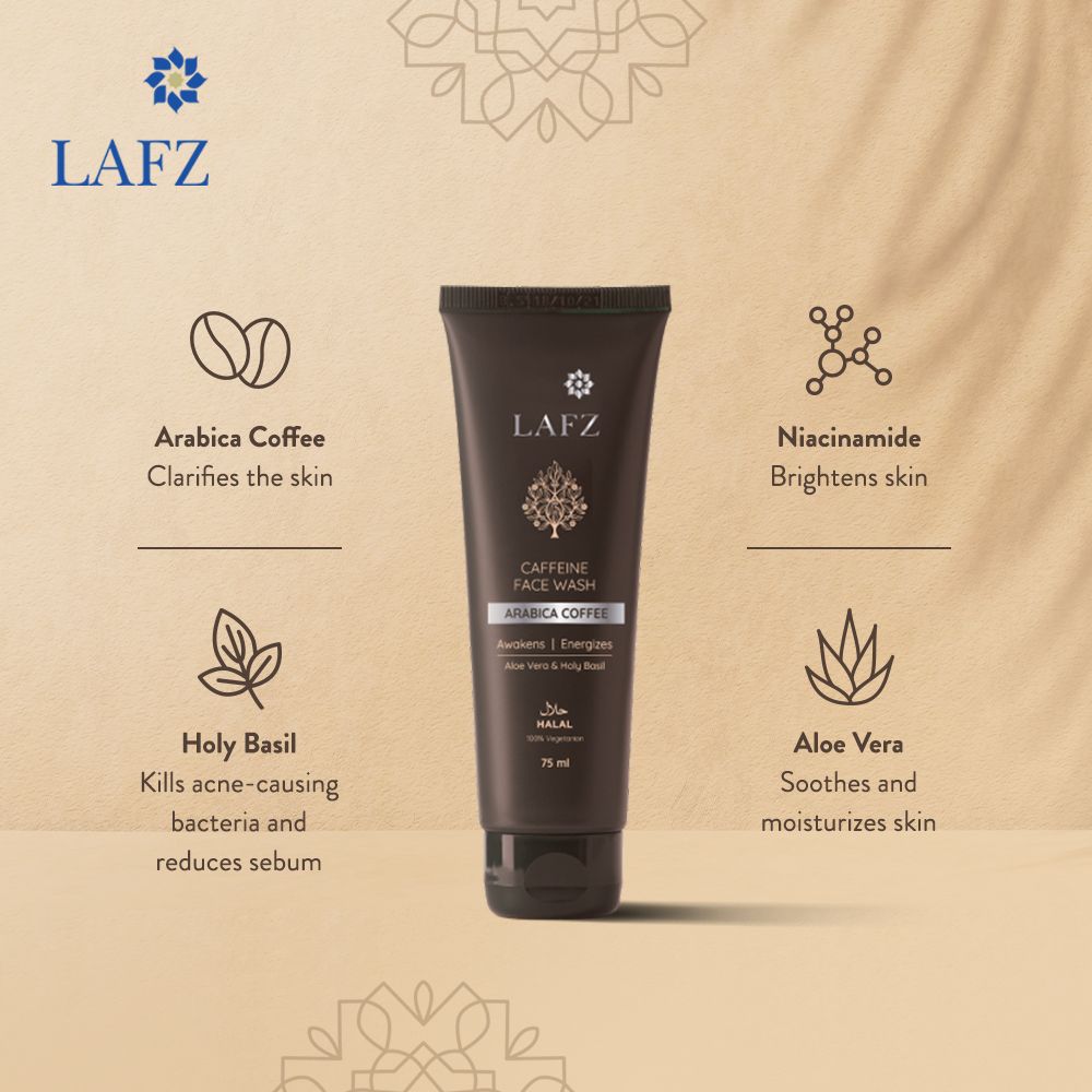 If you want an energizing start at any time of day or night, use Lafz Caffeine Face Wash. Enriched with Arabica Coffee, Niacinamide, Holy Basil and Aloe Vera, it energizes and brightens your skin while locking in moisture, every time you use it!